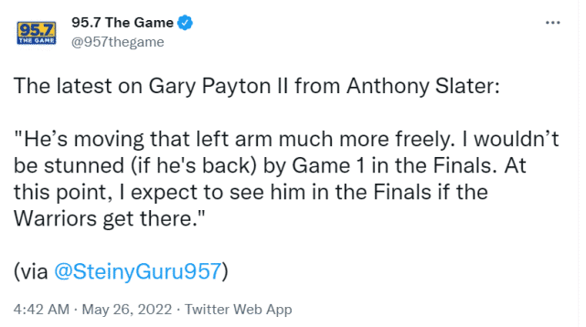 勇士跟队记者Anthony Slater更新了佩顿的伤情。他表示:“佩顿的左臂已经可以更自由地移动,如果他在总决赛G1回归,我不会感到惊讶。以目前的情况来看,如果勇士打进总决赛,我预计他会复出。”