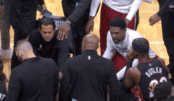 在第一节一次暂停时,热火功勋老将哈斯勒姆对热火球员训话,斯波尔斯特拉不断点头,巴特勒也点头认可;看到热火落后这么多,哈队确实急了,他希望用这样的方式点燃球队。