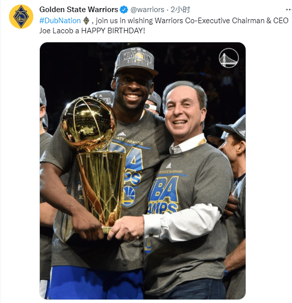 勇士官方晒出拉科布和格林一起捧着总冠军奖杯的夺冠照,发推写道:让我们一起祝贺勇士老板生日快乐。