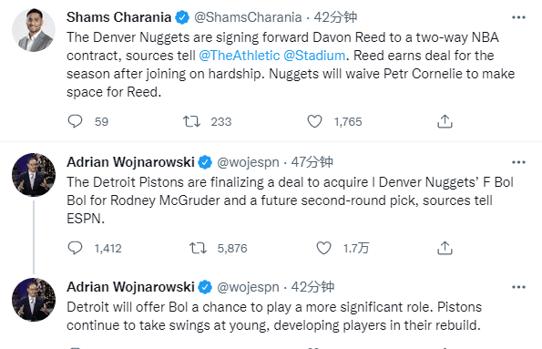 360直播01月10日讯 ,NBA又有一笔交易达成,据ESPN名记沃纳罗斯基报道,掘金与活塞达成交易,掘金送出前锋波尔-波尔,从活塞得到了麦格鲁德和一枚未来的二轮签;活塞获得的选秀签是一枚来自篮网的2022年的次轮签,活塞将为波尔提供更多的上场机会。