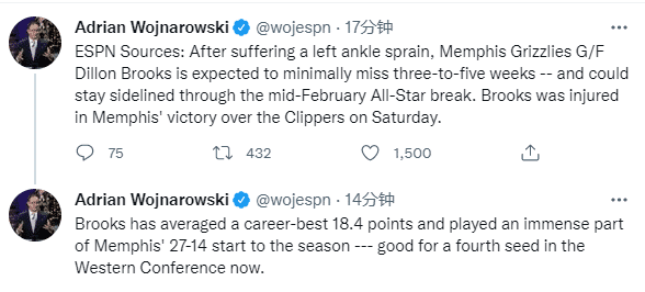 360直播01月10日讯 ,灰熊遭重创,据名记沃纳罗斯基报道,灰熊球员狄龙-布鲁克斯遭遇左脚踝扭伤,预计将至少缺席三到五周,并且可能会缺席整个2月中旬的全明星假期;布鲁克斯场均得到职业生涯最高的 18.4 分,并且在灰熊本赛季 27-14 的开局中发挥了重要作用。