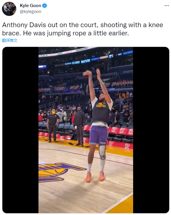 360直播01月10日讯 ,湖人迎来一个好消息,浓眉参加了赛前投篮训练;湖人记者Kyle Goon晒出浓眉训练的画面,浓眉佩戴护膝进行投篮训练,投篮时脚不离地,不过这已经浓眉康复路上的一大进步,伤后不到一个月,已经开始进行投篮训练。
