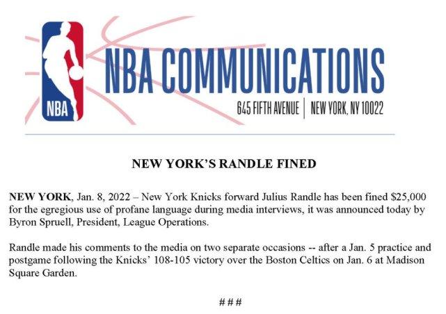 360直播01月09日讯 ,NBA官方宣布,尼克斯球员兰德尔因在采访中滥用亵渎性质的语言,而被罚款2.5万美元。他在1月6日训练和1月7日比赛之后的采访中都出现这一问题。