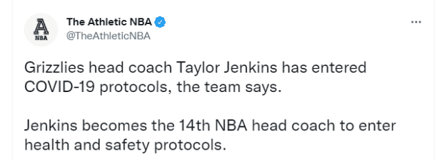 360直播01月09日讯 ,灰熊队宣布,球队主教练泰勒-詹金斯触发健康安全协议。他成为了本赛季第14位触发健康安全协议的主教练,而在他之前,莱尔、金特里、沃格尔、蒙蒂-威廉姆斯、里弗斯、马龙、比卢普斯、马克-戴格诺特、多诺万、泰伦-卢、麦克米兰、布登霍尔泽、基德都曾中招。