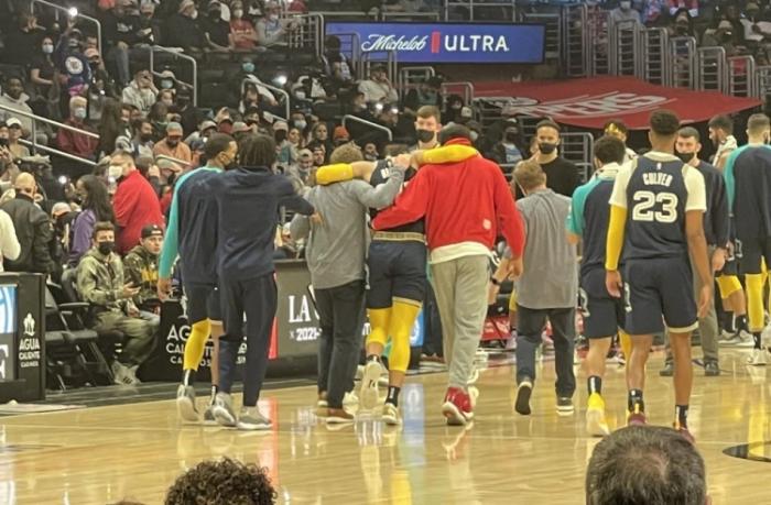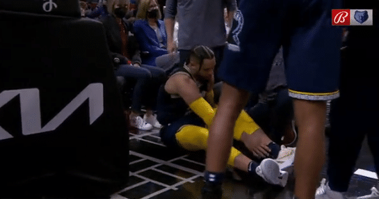 第二节刚开始不久,灰熊球员狄龙-布鲁克斯在断球后快速反击,上篮时不慎崴伤脚踝,慢镜头显示他的左脚呈90度崴伤,崴脚之后布鲁克斯痛苦倒地,坐在底线附近十分难受,由于左脚不能用力,最终被两人搀扶离场,返回更衣室接受检查。
