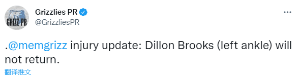 灰熊官方已经宣布,狄龙-布鲁克斯因左脚踝扭伤,本场比赛不会回归。