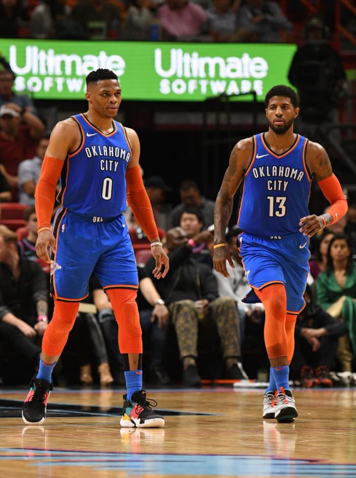 18-19赛季,威少和乔治都为雷霆效力,他们带队杀进季后赛(首轮1-4被开拓者淘汰出局);在这个休赛期,乔治主动申请离队,最终被交易到快船,联手小卡组成快船双核;乔治离队后,威少也申请离队,与保罗互换东家从而加盟火箭,与哈登仅合作一年,双MVP组合解体。