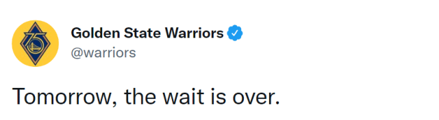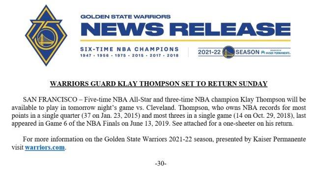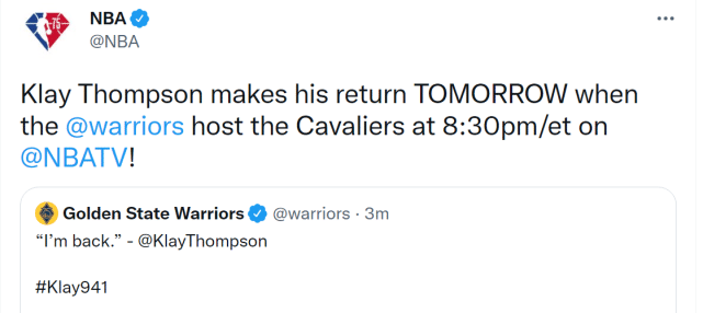 360直播01月09日讯 ,勇士官方更新晒出了汤普森的视频。视频中,汤普森说道:“勇士国度,我回来了!”勇士官方配文附上#Klay941,缺席941天后,汤普森终于回来了。NBA官方转发勇士社媒,预告汤普森对阵骑士复出。勇士官方随后再次发文:“明天,等待结束了。”勇士PR正式公布:汤普森明日复出!