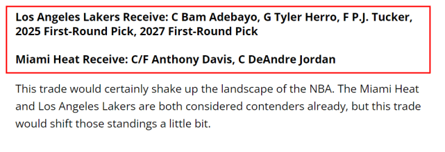 这笔方案的具体内容是:湖人送出浓眉和小乔丹,得到热火的阿德巴约、泰勒-希罗、PJ-塔克、2025年首轮签和2027年首轮签。