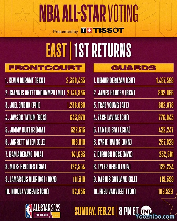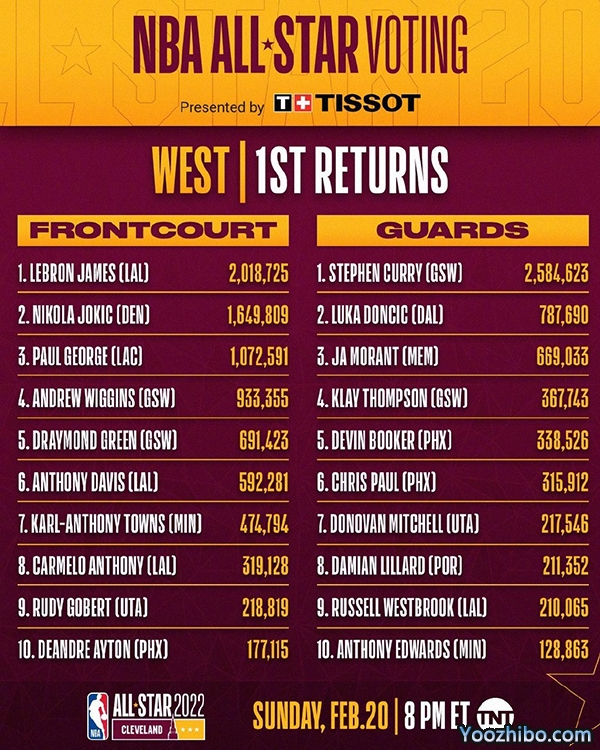 2022全明星首轮投票,凯文-杜兰特与斯蒂芬-库里当选首轮东西部票王!两人分别得到了2,360,435票与2,584,623票。另外勒布朗-詹姆斯与德玛尔-德罗赞分别领跑西部前场与东部后场。