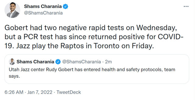 360直播01月07日讯 ,据名记查拉尼亚报道,爵士中锋鲁迪-戈贝尔再次感染新冠,触发健康安全协议。戈贝尔在北京时间周四的两次快速测试结果均为阴性 ,但一次核酸检测的结果显示呈阳性。戈贝尔曾是NBA第一位确诊新冠的球员,如今他再次中招,成为爵士队内第二位触发协议的球员。另外,雄鹿球星霍乐迪也在今天触发健康安全协议。