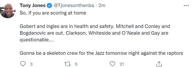 此前,英格尔斯触发协议,让爵士成为联盟最后一支有球员触发协议的球队,30支球队全部都有中招的经历。现在随着戈贝尔触发协议,爵士突然陷入人员危机。据爵士记者报道,爵士除了戈贝尔和英格尔斯,米切尔、康利和博格达诺维奇也不会出战明日对猛龙的比赛,另外,克拉克森、怀特塞德、奥尼尔和盖伊都是出战成疑的状态。他们有5名球员确定缺阵,4名球员出战成疑。