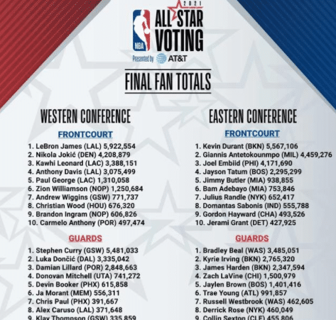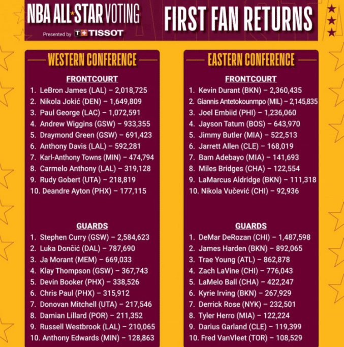 360直播01月07日讯 ,NBA公布了2022年全明星首轮投票结果,这其中东西部的票王被杜兰特和库里占据,杜兰特的票数是2360435票,库里是2584623票,库里也是第一期的票王。外界关注的詹姆斯位居西部前场第一名,他的票数是2018725票,在所有运动员中排名第4,仅次于字母哥、杜兰特和库里。