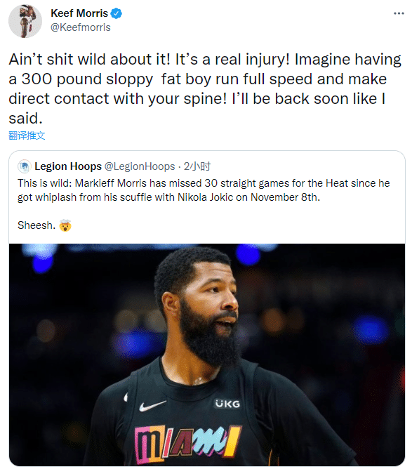 360直播01月07日讯 ,美媒legion Hoops晒出,自从11月8日掘金和热火冲突之后,大莫里斯因伤连续缺席30场比赛,对此,大莫里斯本人回应并且直言约基奇是一个300磅的邋遢大胖子。