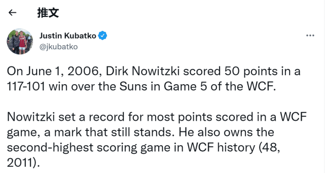 为了表示致敬,数据专家Justin Kubatko连续更推晒出了司机生涯各种传奇数据。在2001年5月14日,诺维茨基在季后赛对阵马刺的比赛中砍下42分18板6抢断,自从73-74赛季引入抢断数据以来,乔丹和司机是历史上仅有的2名能在季后赛单场送出至少40分15板5抢断的球员。