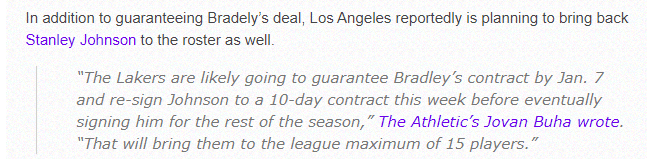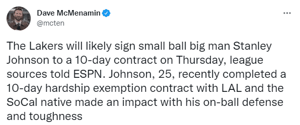 360直播01月06日讯 ,据名记Dave Mcmenamin报道,洛杉矶湖人会在本周五重新签下斯坦利-约翰逊,另一记者Jovan Buha也报道,湖人将用10天合同重新签下斯坦利-约翰逊,然后最终签约到赛季结束;25岁悍将即将回归,继续为湖人效力助詹姆斯冲击总冠军。