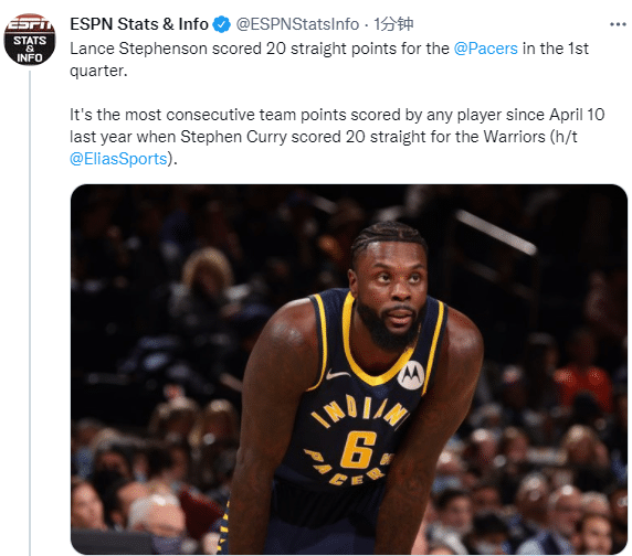 史蒂芬森单节连得20分创纪录,成为去年4月库里之后联盟第一位连续得分20+的球员,师弟也成为NBA历史上第一位替补登场在第一节独砍20分的球员。