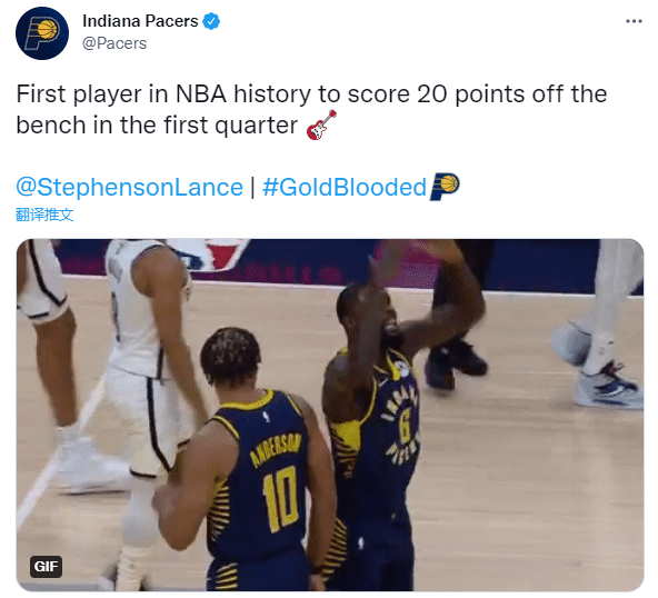 第一节6分23秒,史蒂芬森替补上场,步行者全场球迷为他鼓掌欢呼,31岁师弟上场便轰进三分,弹吉他疯狂庆祝,之后史蒂芬森开启疯狂的得分模式,连续突破杀到禁区得分,中投以及三分全都有,第一节压哨三分又点燃全场,步行者替补席彻底沸腾了。