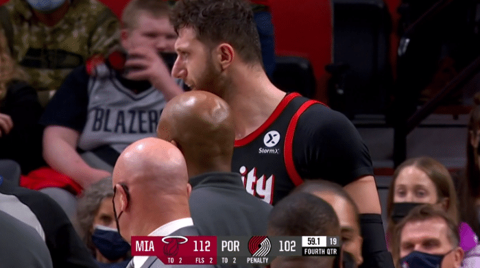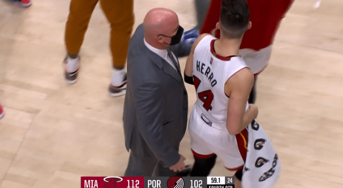 比赛还剩59秒,努尔基奇掩护撞倒希罗,希罗情绪暴怒,站起来从背后推了努尔基奇一把,努尔基奇立即回应,一巴掌打到希罗的头部,双方互喷发生冲突,多名球员围过来,所幸及时拉开双方阻止冲突恶化,经过回放之后,两人都被驱逐离场。