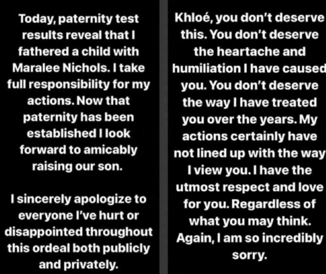360直播01月05日讯 稍早之前,NBA球星特里斯坦汤普森在自己的社交媒体上公开发文承认自己出轨并且有一个私生子,并且向自己的前妻科勒卡戴珊进行了诚挚的道歉。在文中TT承认自己在和科勒交往期间出轨自己的私教玛拉莉尼克尔斯,并让后者怀上了自己的孩子,不过对于前妻科勒,他还是怀有极大的尊重和爱,认为科勒不应该承受自己给她带来的一系列心痛和羞愧,自己确实愧对于他。