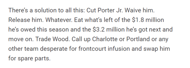 火箭需要解决这个问题,斯通需要解决这个问题。波特赛季结束后就有续约资格,伍德的合同也还剩一年。Mannix认为火箭不应该留下这两个球员。“裁掉波特,放弃他,任何方式都可以。吃掉他本赛季余下的180万美元和下赛季的320万美元,然后继续前进。交易伍德,给夏洛特或者波特兰等急需前场的球队打电话……”