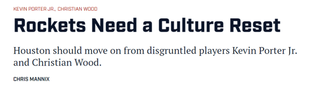 对掘金一战,波特和伍德在更衣室里和68岁助教卢卡斯发生冲突。波特拿东西砸向卢卡斯,伍德拒绝在下半场出战。事后,波特表达歉意,两人均接受火箭禁赛一场的处罚。Mannix认为这件事不应该就此翻篇,两人都不适合火箭的未来,应该及时处理掉。