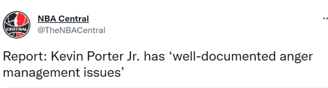 名记沃纳罗斯基曾报道称,波特的愤怒情绪管理问题有据可考,此前在骑士效力时,类似的事件也发生过。波特因更衣柜变动,而大闹更衣室,乱扔食物。如今,他又出现类似的情况。伍德虽然签约火箭后表现尚可,但他的斗志和努力程度已经遭到教练组的质疑。