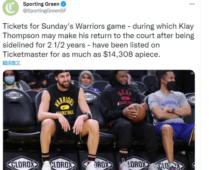 360直播01月05日讯 ,来自美国票务网站Ticketmaster的数据显示,当地时间周日勇士与骑士的比赛,也就是汤普森计划中的复出之战,比赛最贵的票价已经被炒到了14308美元,直逼库里破三分纪录时麦迪逊广场花园的最贵票价14700美元。毫无疑问,汤普森这场复出之战,将点燃大通中心最狂热的一面。
