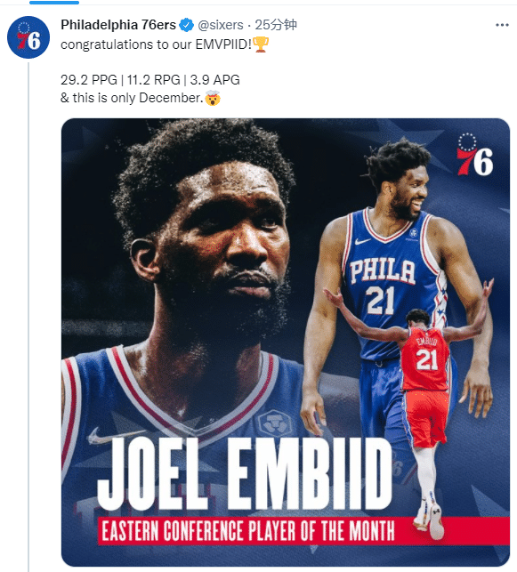 整个12月,恩比德为费城出战13场比赛,昌吉拿到29.2分11.2篮板3.9助攻,8次拿到两双,其中客战黄蜂轰下43分15篮板;目前费城20胜16负排在东部第六名。