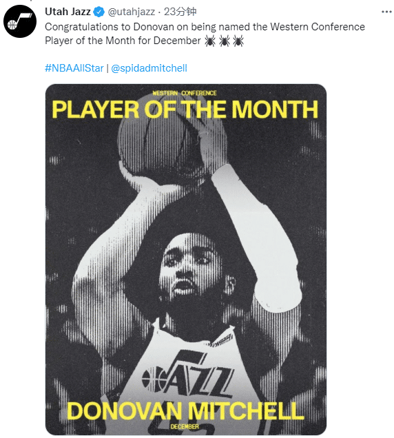 米切尔职业生涯首次获得西部月最佳,爵士官方第一时间恭喜米切尔
