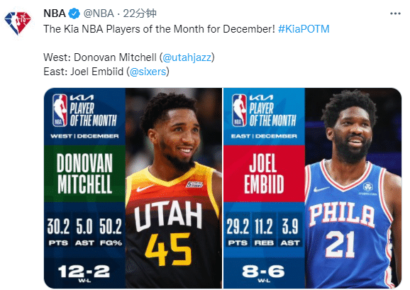 360直播01月05日讯 ,NBA官方正式公布本赛季12月东西部月最佳球员,恩比德和米切尔分别当选,詹姆斯和杜兰特都是场均30+遗憾落选。