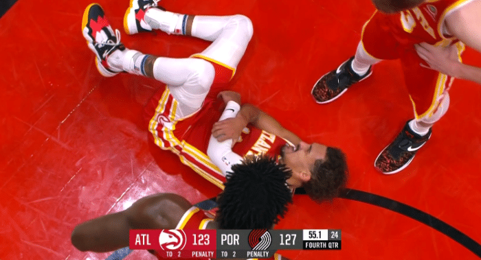 末节,特雷-杨不在场,开拓者12-4重新获得领先,7分40秒吹杨回来,两队突然得分停滞,关键时刻,吹杨突破上篮,开拓者立即回应;生死时刻,特雷杨轰进三分,努尔基奇踢球违例,赖特续命三分,吹杨造犯规两罚全中,被弩机撞倒痛苦倒地,之后两罚再中,弩机关键2+1,吹杨连续三分续命,最终老鹰遗憾惜败。