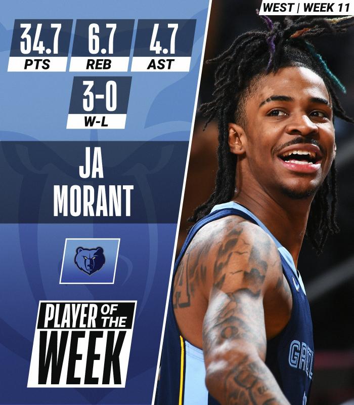 22岁莫兰特生涯首次夺得西部周最佳,本赛季场均拿到24.7分5.7篮板6.6助攻,23胜14负排在西部第四名。