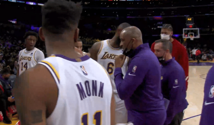 威少关键时刻出现致命发球五秒违例,直接把球权白送给森林狼;对此,沃格尔摘掉口罩并且露出无奈的笑容,一脸苦笑;湖人众将走回替补席,詹姆斯走到场边与沃格尔交流了一下,站在附近的威少一脸沮丧。