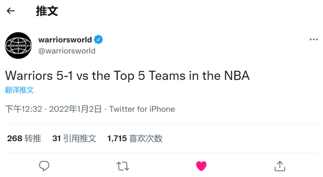 勇士本赛季不仅战绩全联盟最佳,而且他们在面对联盟顶级球队时也取得了傲人的成绩。据美媒warriorsworld统计,勇士目前对阵联盟前5球队拿到5胜1负,其中22分大胜公牛,18分轻取篮网,两次击败太阳,今天又拿下了爵士,唯一输的一场是客场不敌太阳。
