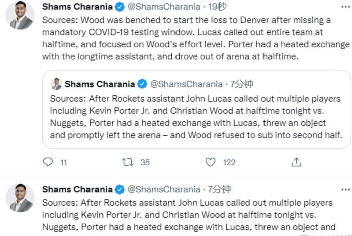 名记Shams爆料了更多的细节“助教卢卡斯点名了小波特和伍德,随后小波特情绪爆发,向后者扔了一个物体,随后迅速离开了球馆,而伍德则拒绝在下半场再替补出场!”火箭官方的报道是小波特下半场在接受左小腿检查所以没出战,伍德则是“自己的决定”目前来看这件事并不简单!