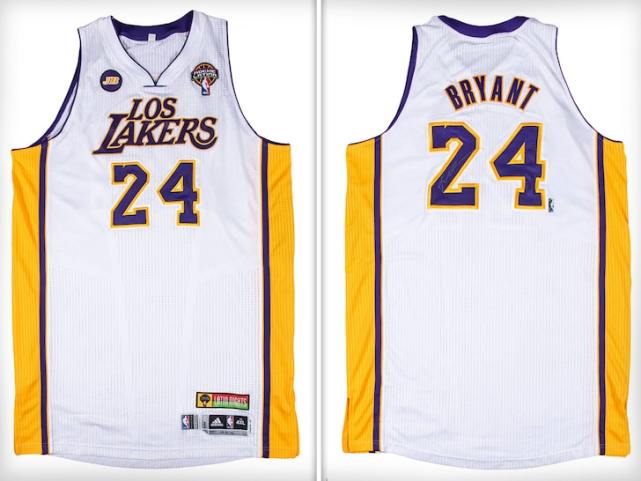 近日,詹姆斯和科比穿过的两件湖人队球衣被拍卖,科比的这件球衣是2013年对阵公牛队所穿的,科比在这见球衣的“2”上面签下了自己的名字。