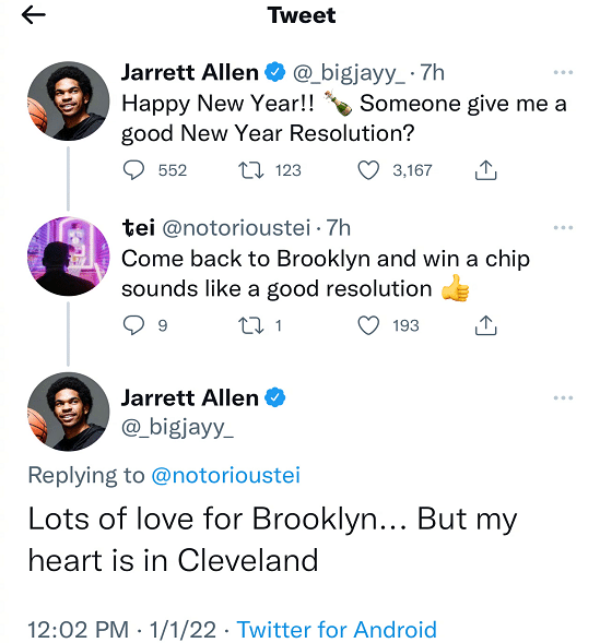 近日有球迷在社交媒体上直接招募阿伦,希望他可以回到篮网,而阿伦也没有回避,而是直接回应,称:布鲁克林有自我的爱,但我的心在克利夫兰。