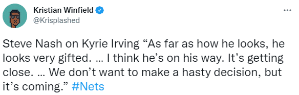 对于欧文何时复出的问题,不久前篮网主帅纳什表示:就目前我所看到的表现来说,欧文的状态很好。我想他已经在复出的路上了,而且越来越接近。我们不想草率地做出决定,但欧文确实接近复出了。
