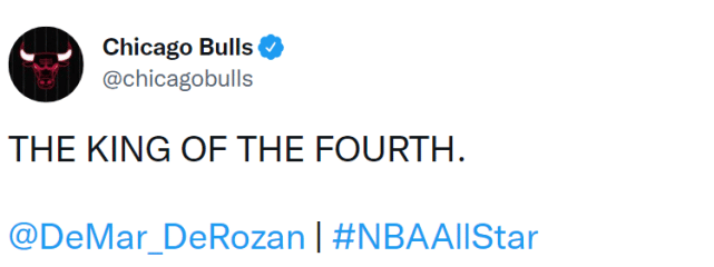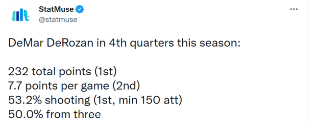 德罗赞的厉害之处,还在于他往往在末节迎来爆发。Statmuse晒出了德罗赞的末节数据:232分排名第一,场均7.7分排名第二,投篮命中率53.2%,在至少150次出手的球员中排名第一,另外,德罗赞末节的三分命中率也达到50%、公牛官媒晒出了庆祝照,配文:末节之王!
