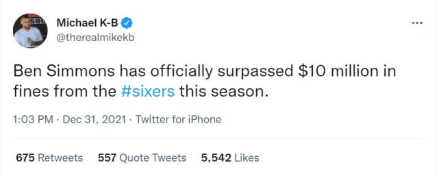 360直播01月01日讯 ,新一年的第一天,据美国NBA记者Michael K-B报道,76人对本-西蒙斯的罚款已经超过1000万美元。