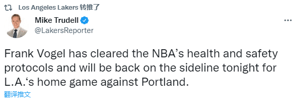 360直播01月01日讯 ,湖人主帅终于回来了,湖人官方转发随队记者MIke Trudell的报道,沃格尔已经解除健康与安全协议,并将在今晚主场对阵开拓者的比赛中重返赛场。
