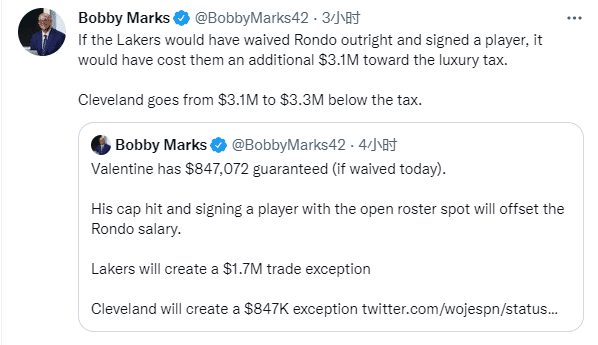 据薪资专家Bobby Marks报道,若湖人直接裁掉朗多并且签下一名球员,他们将会多缴纳310万美元的奢侈税;骑士能获得84.7万美元的交易特例。
