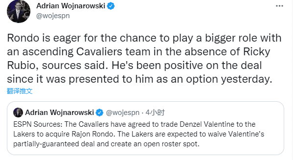 360直播01月01日讯 ,2022年的第一天,据ESPN名记沃纳罗斯基报道,湖人正式把朗多交易到骑士,得到瓦伦丁;湖人将裁掉瓦伦丁,从而为球队后续签人腾出一个名额,并且省下370万美元还创造交易特例。
