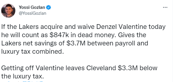 另一薪资专家表示,如果湖人今天裁掉瓦伦丁,湖人总共能省下370万美元。
