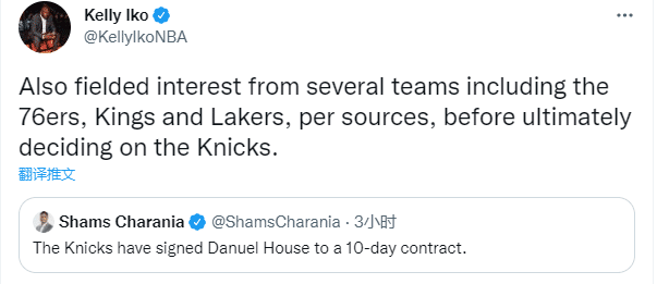 360直播12月24日讯 ,纽约尼克斯官宣签约火箭旧将丹妞尔-豪斯,双方签下10天短合同,不久前才被火箭裁掉便再就业;据名记Kelly Iko报道,湖人、国王和76人等多支球队也有意豪斯,但最终豪斯决定加盟尼克斯。