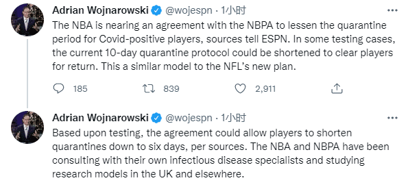 如今联盟计划缩短阳性球员的隔离周期,从原来的10天改为6天,目前该协议还没有最终敲定。