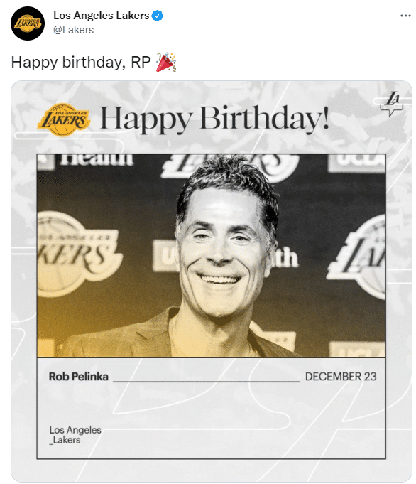 360直播12月24日讯 ,湖人篮球运营副总裁罗伯-佩林卡迎来52岁生日,湖人官方发推为其庆生,晒照并且发推写道:生日快乐!罗伯-佩林卡!