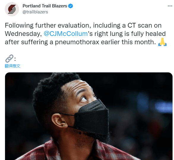 360直播12月24日讯 ,波特兰开拓者好消息,开拓者开拓者官方宣布,球队后卫CJ-麦科勒姆已从气胸中痊愈,他将于一周后重新接受评估;恭喜麦科勒姆完全康复,因气胸怪病已经连续缺席8场比赛,开拓者双枪合体倒计时。