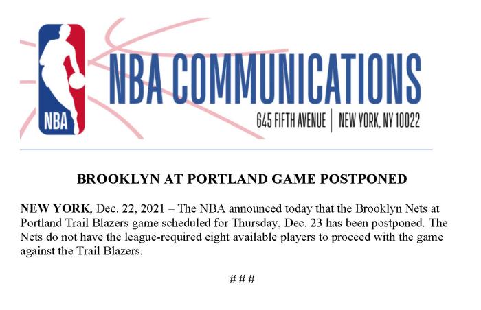 360直播12月23日讯,由于联盟新冠疫情全面爆发,NBA不想延期比赛也不行;NBA官方再次宣布延期两场比赛,篮网对阵开拓者和猛龙对阵公牛的比赛都已被推迟,原因是篮网、猛龙都不能凑够8名球员上场。